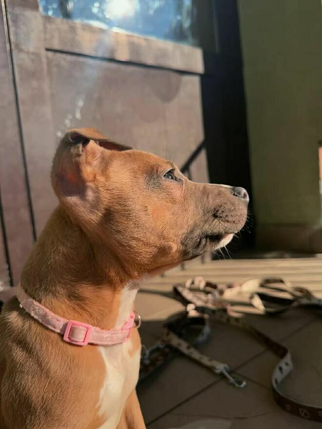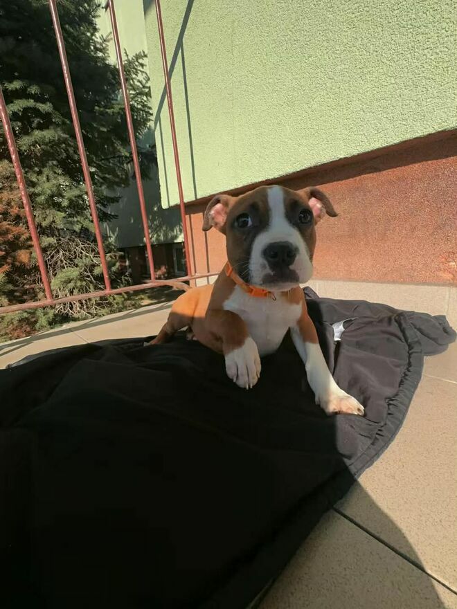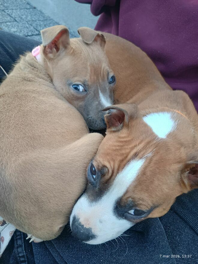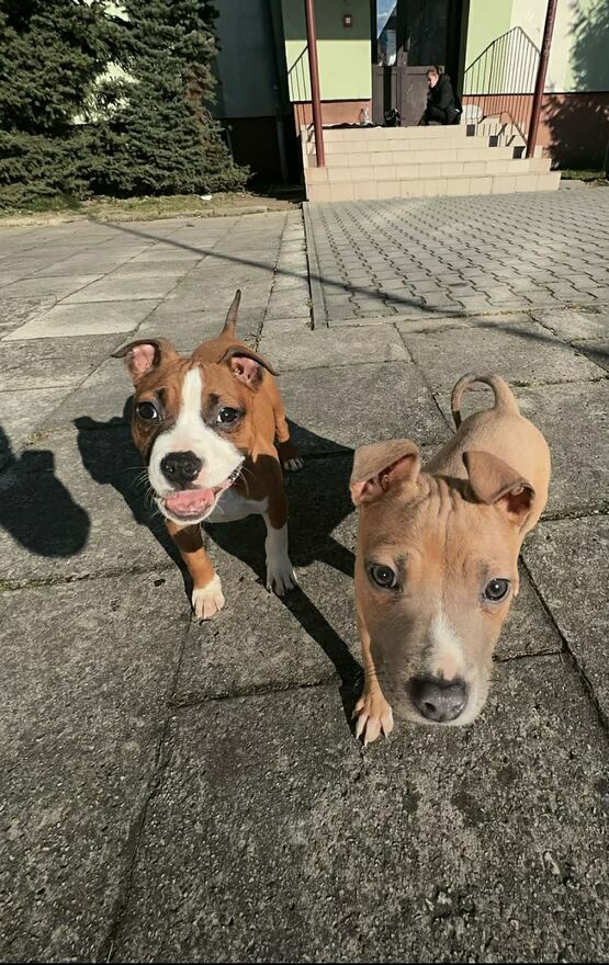 Dwa szczenięta rasy American Staffordshire Terrier.Mają 5 miesięcy, oba samce.